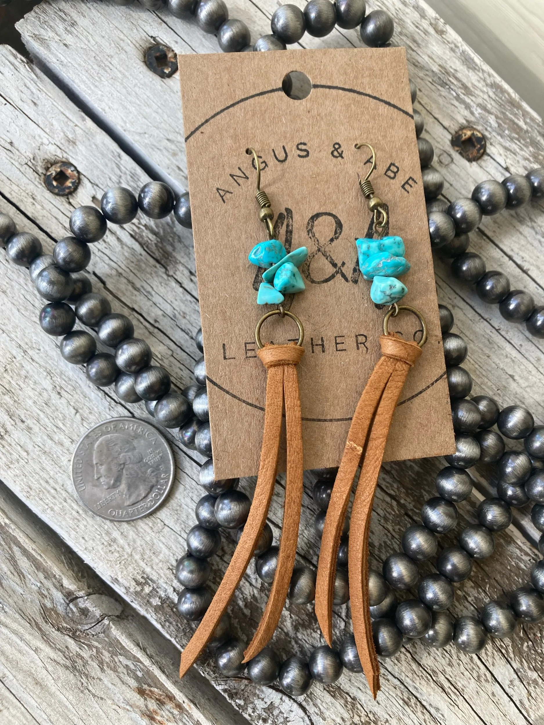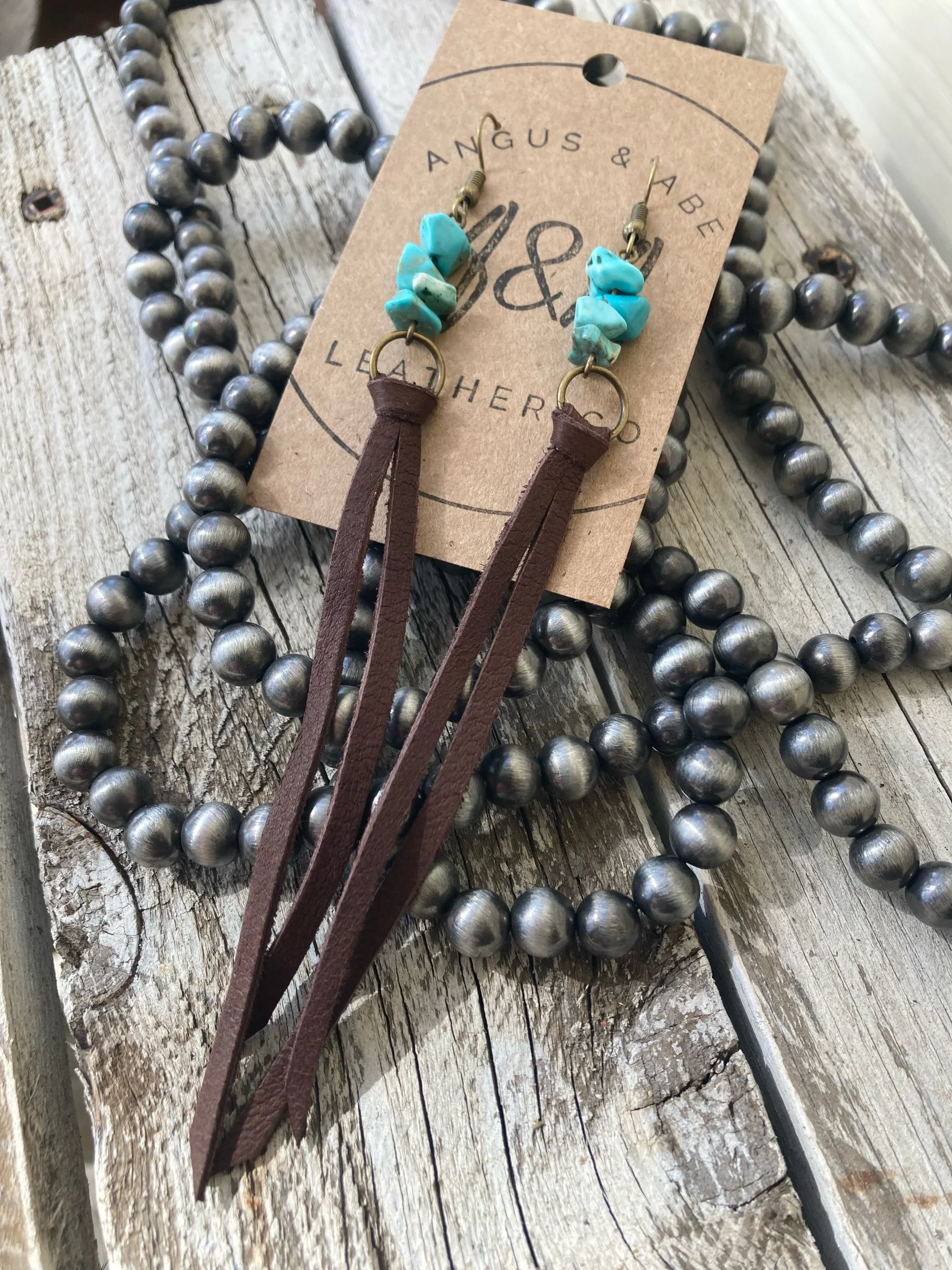 Faux turquoise chips with deerskin leather lace fringe dangles. These drop about 4-5” and have brass ear wires.