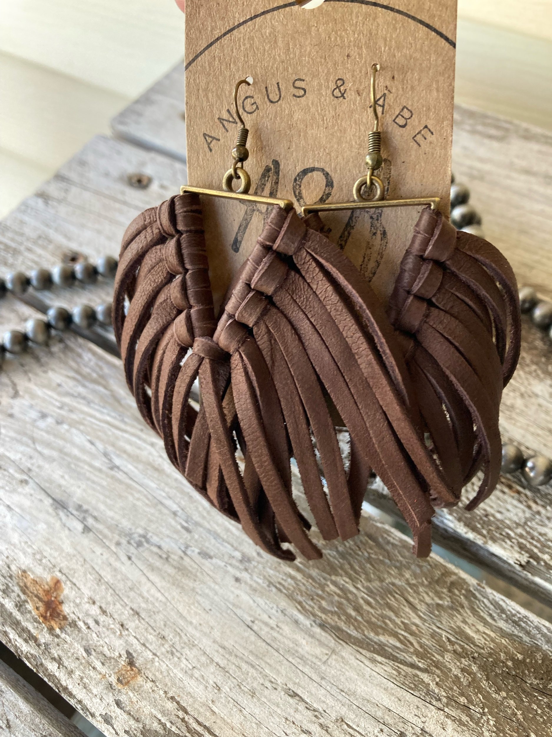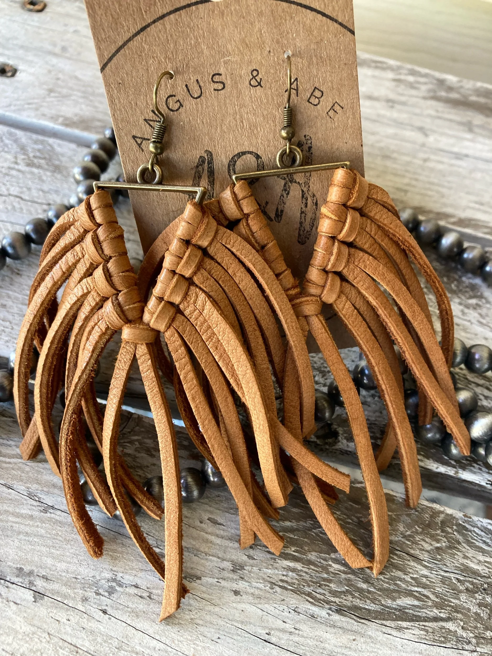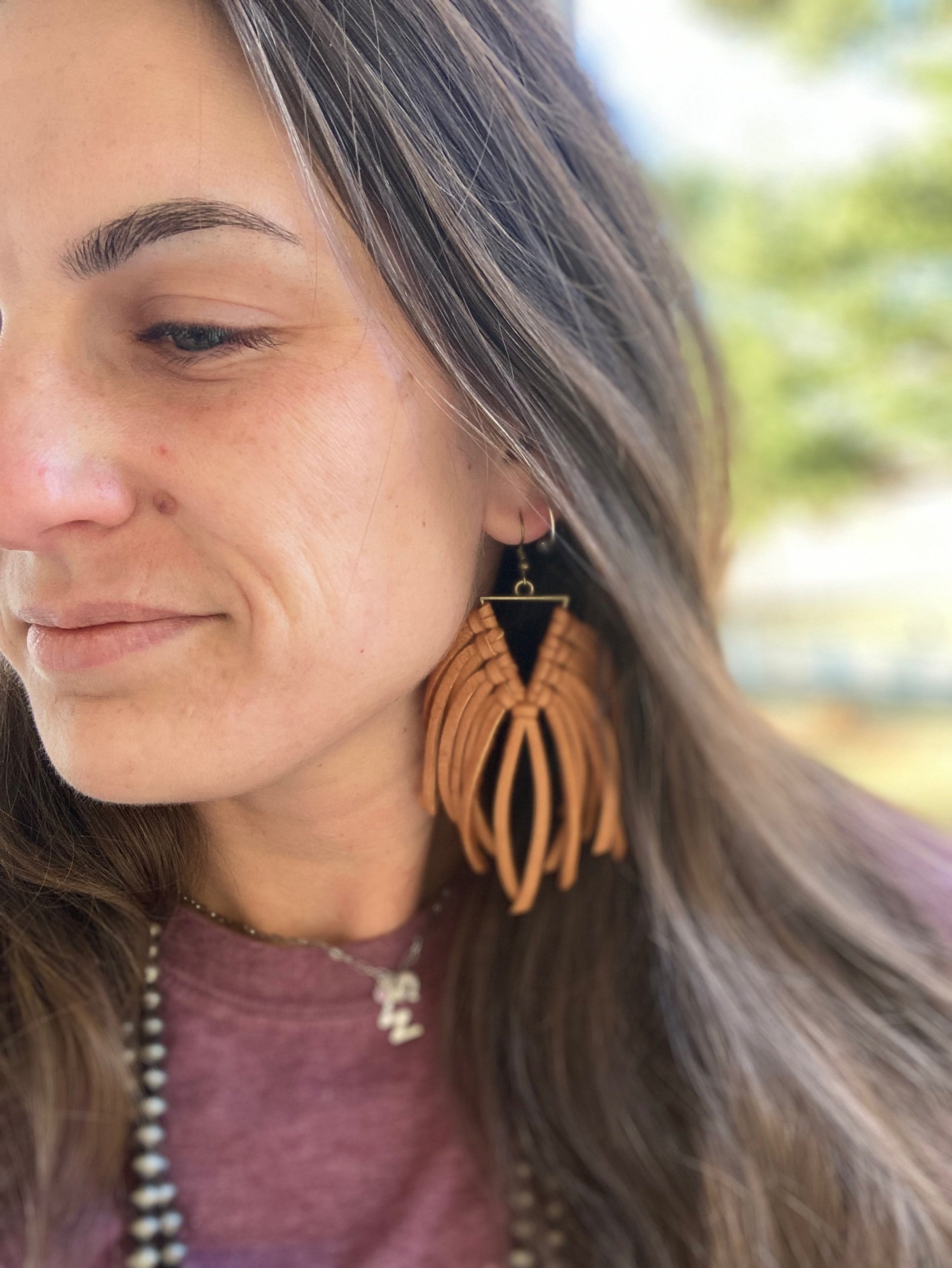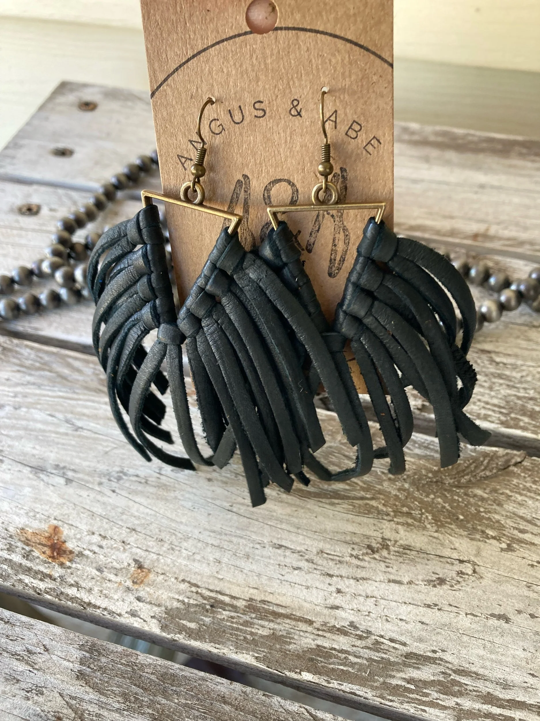 Light-weight brass triangle with deerskin leather lace fringe. Even with all the fringe, I would still consider these light weight earrings. Brass ear wire.