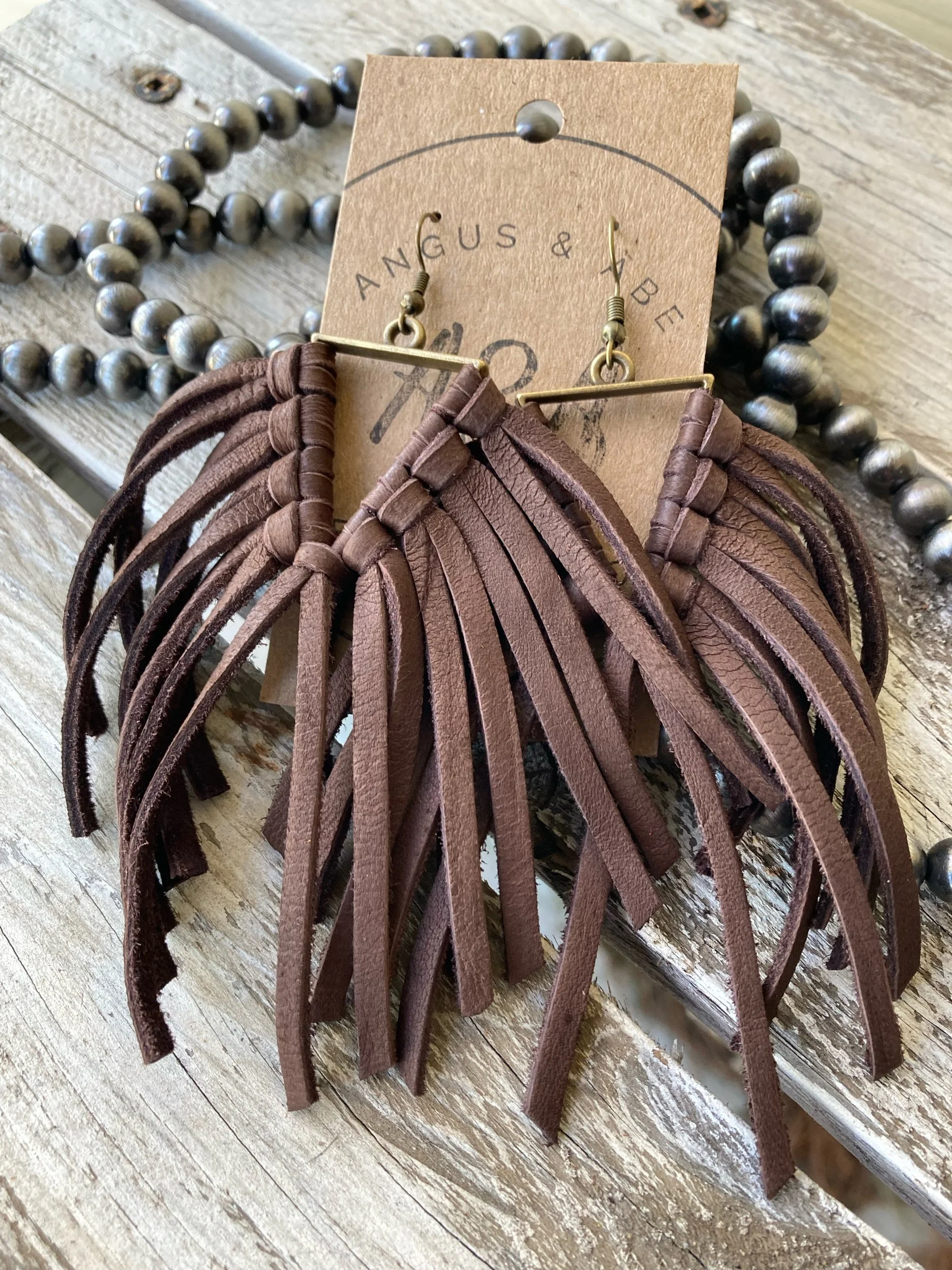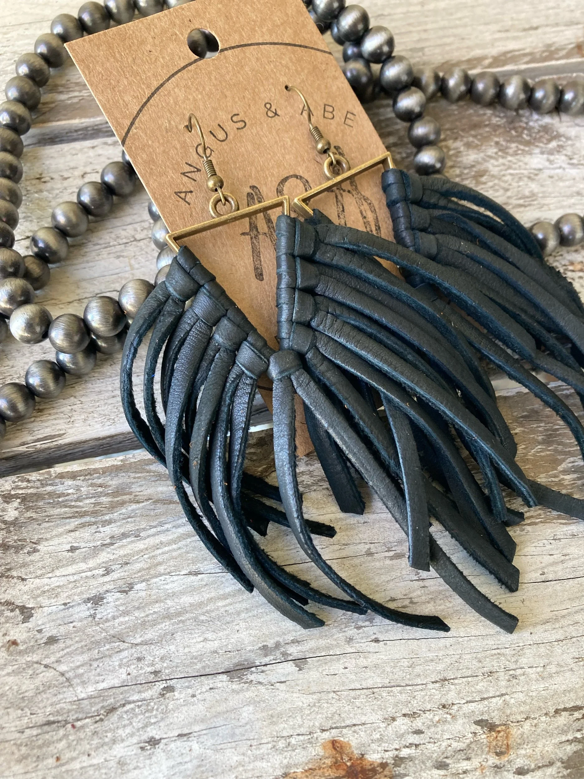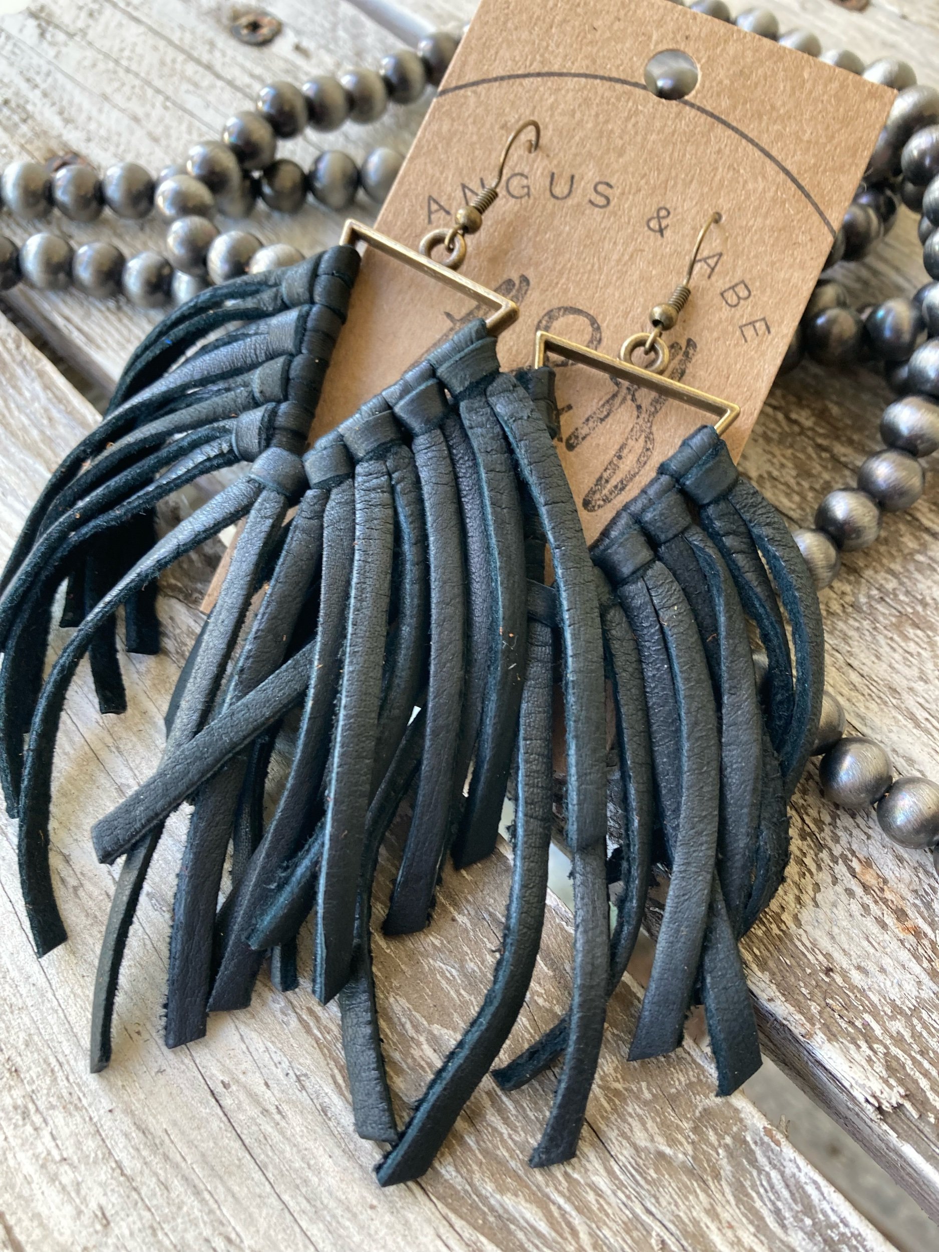 Light-weight brass triangle with deerskin leather lace fringe. Even with all the fringe, I would still consider these light weight earrings. Brass ear wire.