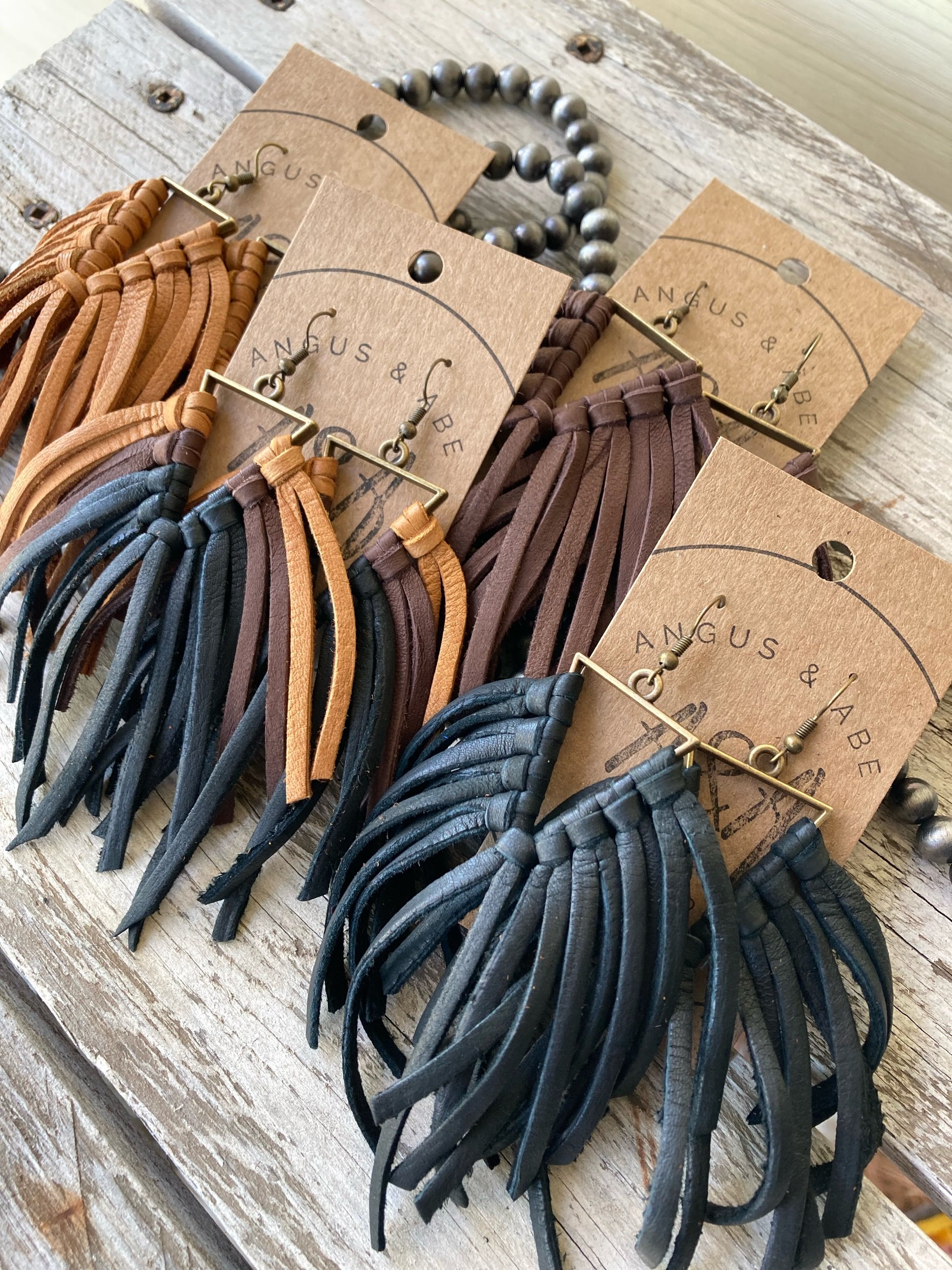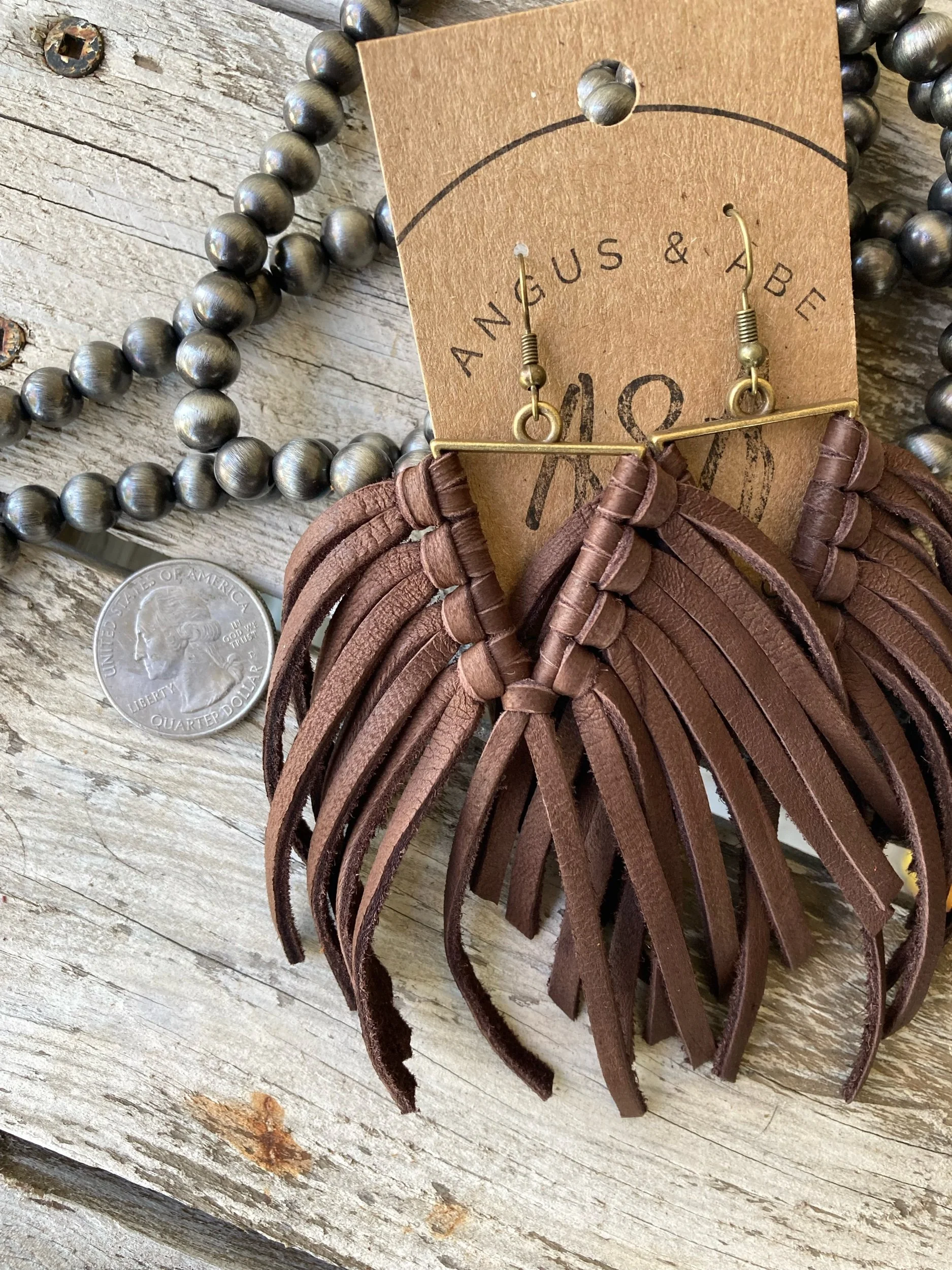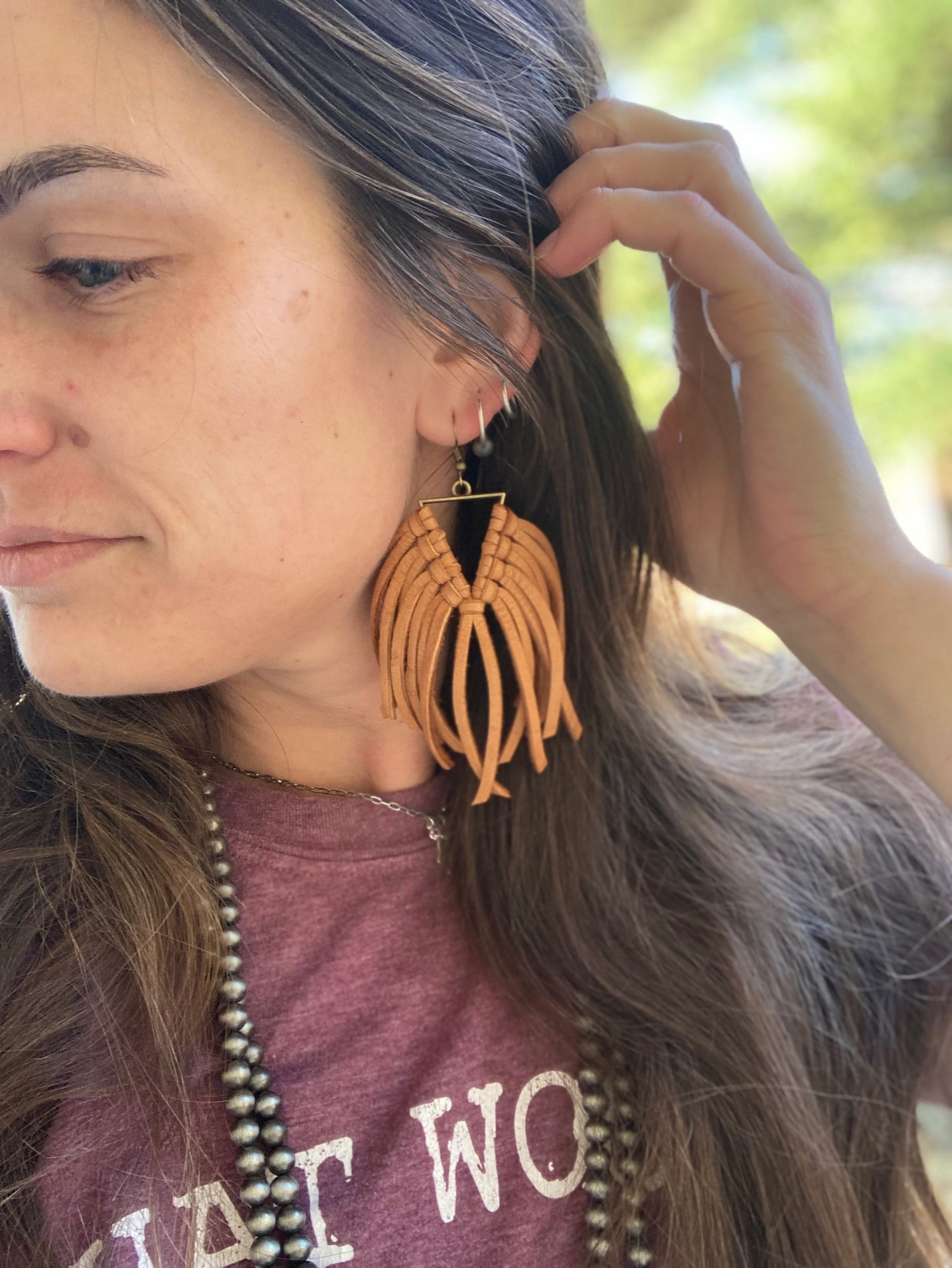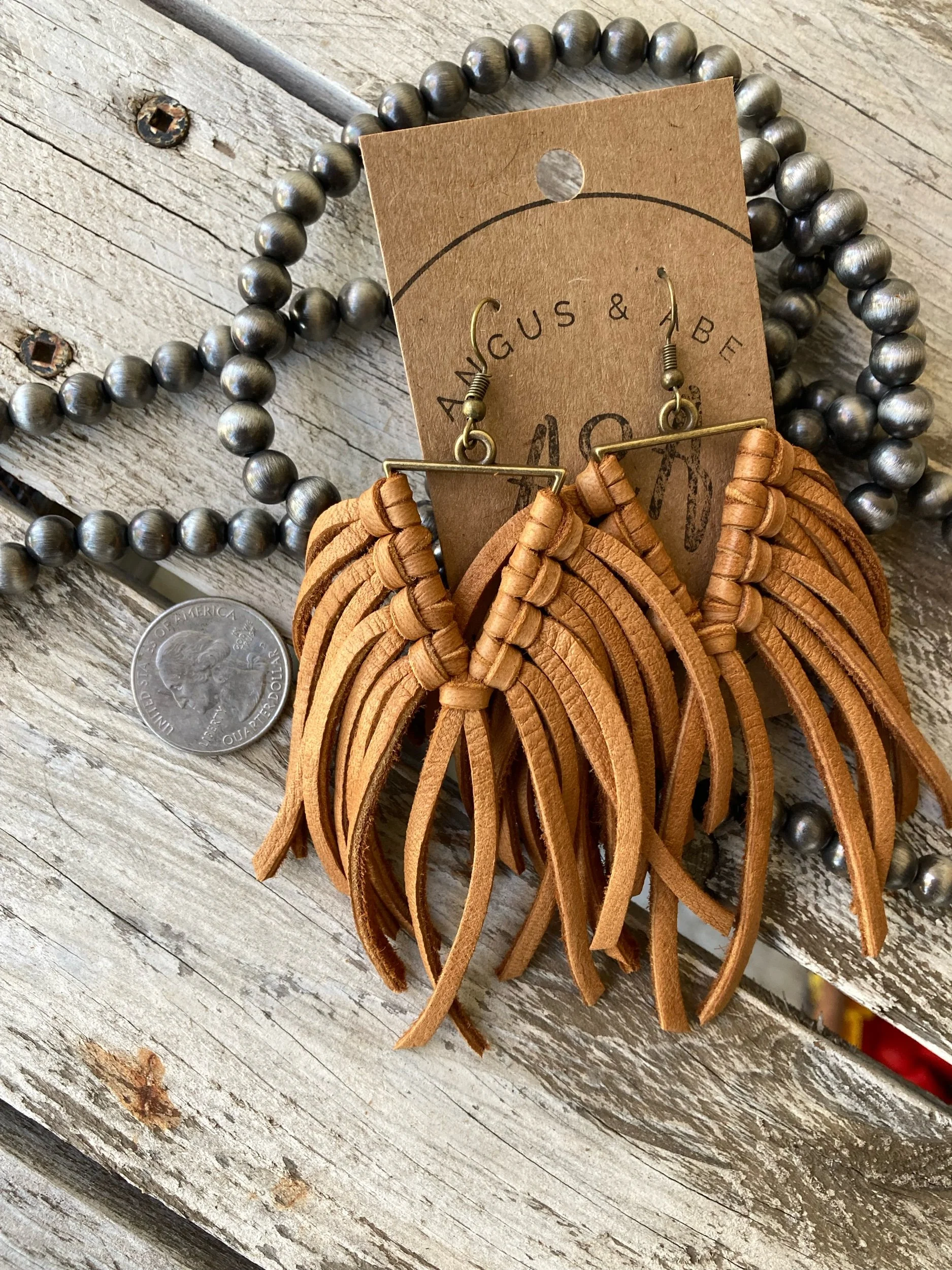 Light-weight brass triangle with deerskin leather lace fringe. Even with all the fringe, I would still consider these light weight earrings. Brass ear wire.